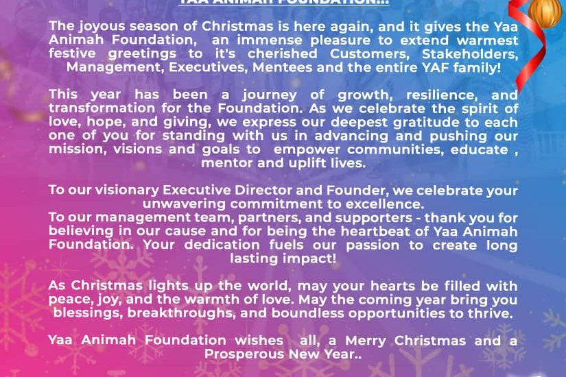 The joyous season of Christmas is here again, and it gives the Yaa Animah Foundation, an immense pleasure to extend warmest festive greetings to it’s cherished Customers, Stakeholders, Management, Executives, Mentees and the entire YAF family!